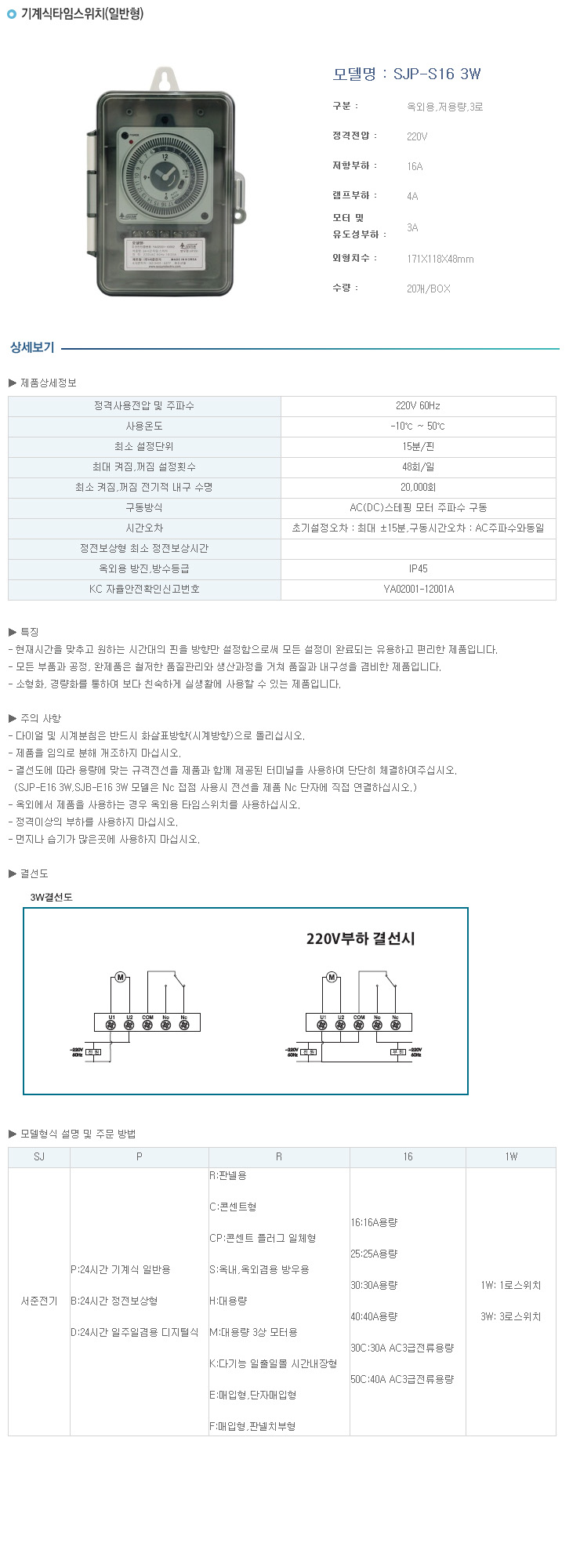 [¼­ÁØ]¿Á¿Ü¹æ¼ö¿ë ÀϹÝÇü ŸÀÓ½ºÀ§Ä¡(SJP-S16 3W, 1Kw¹Ì¸¸ºÎÇÏ, ±â°è½Ä 3·Î ŸÀÓ½ºÀ§Ä¡)(Mechanical Time Switch)