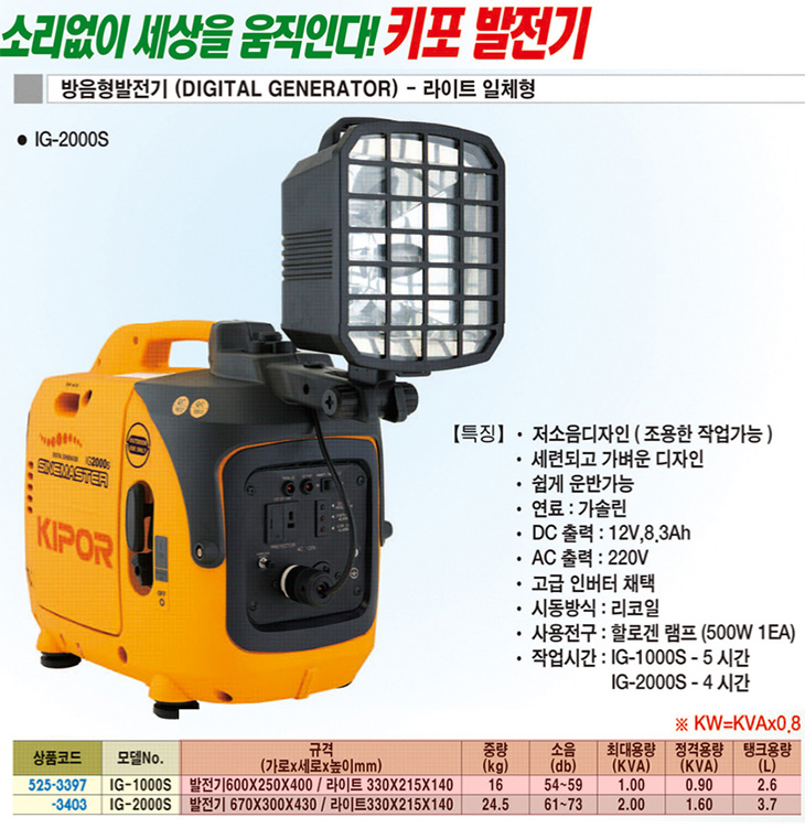 [ŰÆ÷]¹æÀ½Çü ¹ßÀü±â(IG-1000S,1KVA,°¡¼Ö¸°¿¬·á,AC220V/DC12VÃâ·Â,500Watt Çҷΰշ¥ÇÁ)(Digital Generator)