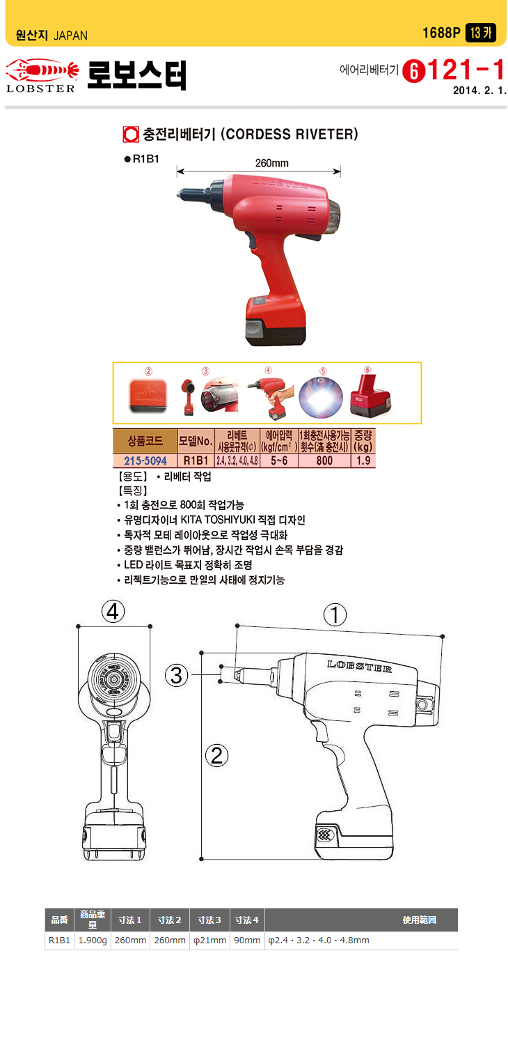 [LOBSTER] ÃæÀü ¸®º£Åͱâ(R1B1,2.4/3.2/4.0/4.8mm)(Cordless Riveter)