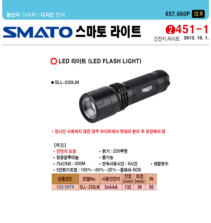 [½º¸¶Åä] LED ¶óÀÌÆ®(SLL-230LM, 5´Ü¹à±âÁ¶Àý/ÃÖ´ëÃâ·Â 230·ç¸à, 132x36mm)(LED FLASHLIGHT)
