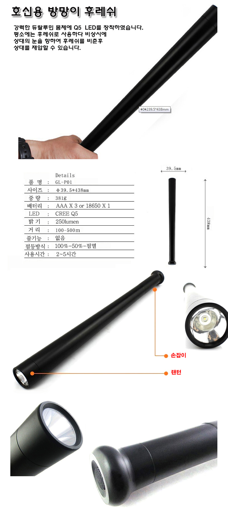 [PT] ¹æ¹ü¿ë/È£½Å¿ë LED ·£ÅÏ/ÈÄ·¹½¬/¼ÕÀüµî(GL-P01,438x39.5mm, 381g, CREE Q5 °íÈÖµµLED)(°ïºÀ/¹æ¹æÀÌ/ÈÞ´ë¿ë ·£ÅÏ/ÈÄ·¹½¬/¼ÕÀüµî)