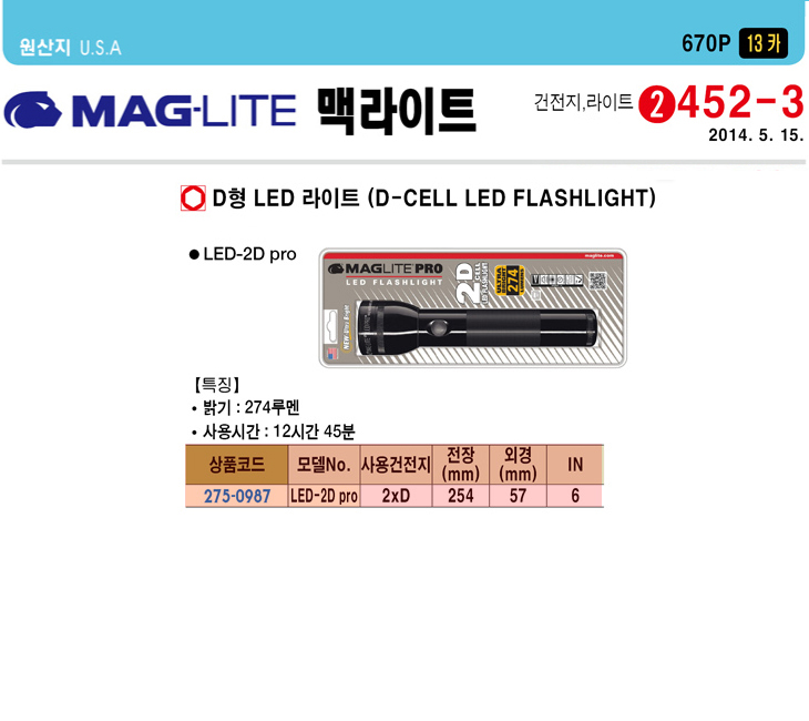 [¸Æ¶óÀÌÆ®] DÇü LED ¶óÀÌÆ®(LED-2D Pro, Dx2°³, 254x57mm)(LED ¼ÕÀüµî/·£ÅÏ/ÈÄ·¹½¬)(D-CELL LED FLASH LIGHT)=>Á¦Ç°´ÜÁ¾!