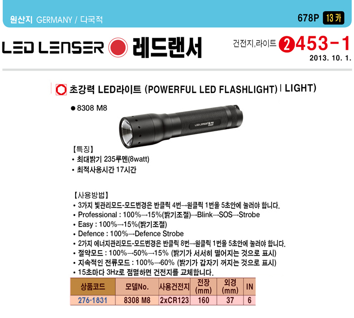 [·¹µå·£¼­] Ãʰ­·Â LED ¶óÀÌÆ®(8308 M8, CR123x2°³, 160x37mm, 235·ç¸à/8Watt)(Powerful LED Flashlight)