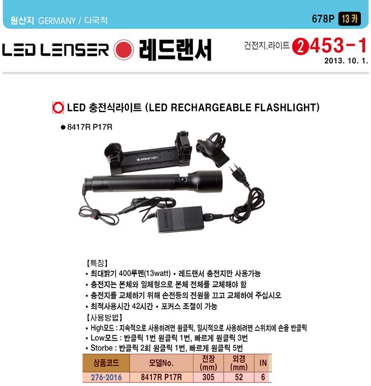 [·¹µå·£¼­] LED ÃæÀü½Ä ¶óÀÌÆ®(8417R P17R ÃæÀü½Ä, 400·ç¸à/13.0Watt)(LED Rechargeable Powerful Flashlight)