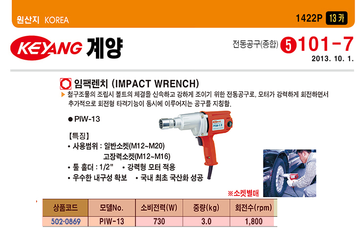 [°è¾ç] Àü±â ÀÓÆÑ·»Ä¡/ÀÓÆÑÆ®·»Ä¡(PIW-13,ÀϹݼÒÄÏ:M12~M20/°íÀå·Â¼ÒÄÏ:M12~M16,730Watt)(Impact Wrench)