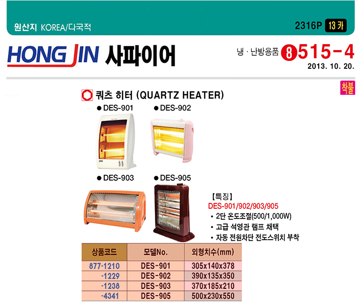 [È«Áø»çÆÄÀ̾î] ÄõÃ÷È÷ÅÍ(DES-902, 390x135x350mm, 500~1000Watt)(Quartz Heater)(ÁÖ¹®Àü Àç°íÈ®ÀÎ)