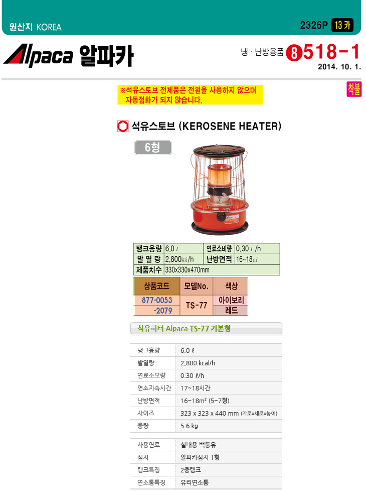 [¾ËÆÄÄ«] ¼®À¯½ºÅäºê(TS-77, 330x330x470mm, 6.0¸®ÅÍ)(Kerosene Heater)