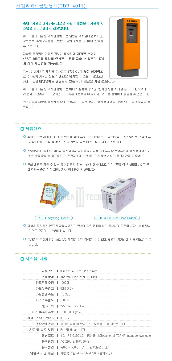 [WT] ÁÖÂ÷±Ç¹ßÇà±â(TDR-4011, PETÀçȰ¿ë ÁÖÂ÷±Ç¹ßÇà±â)(PET Recycle Magnetic Ticket Dispenser)