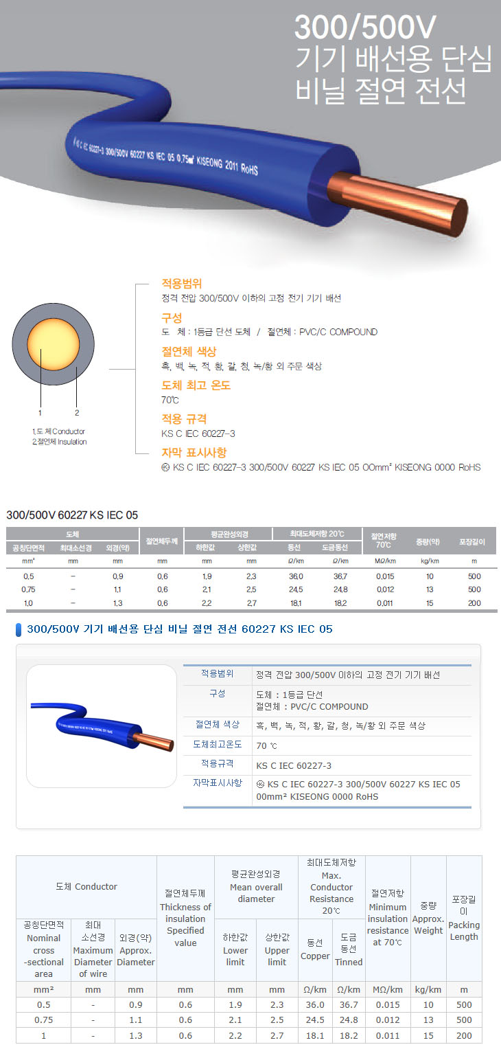 [KS]Àü¿øÄÉÀ̺í 300/500V ±â±â ¹è¼±¿ë ´Ü½É ºñ´Ò Àý¿¬ Àü¼± 60227 KS IEC 05(IV)=>»ý»êÁß´Ü, Á¦Ç°´ÜÁ¾!