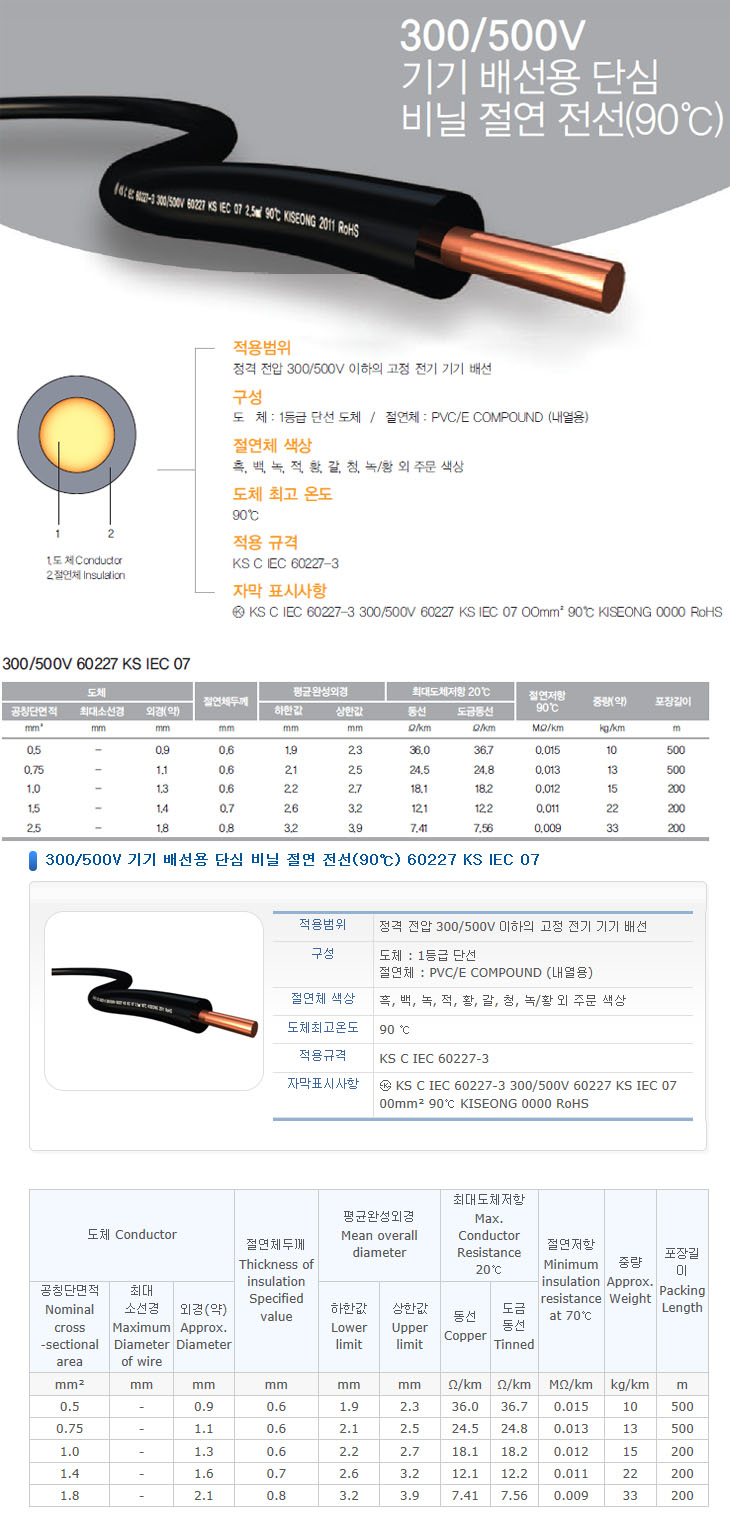 [KS]Àü¿øÄÉÀ̺í 300/500V ±â±â ¹è¼±¿ë ´Ü½É ºñ´Ò Àý¿¬ Àü¼±(90¡É) 60227 KS IEC 07(HIV)
