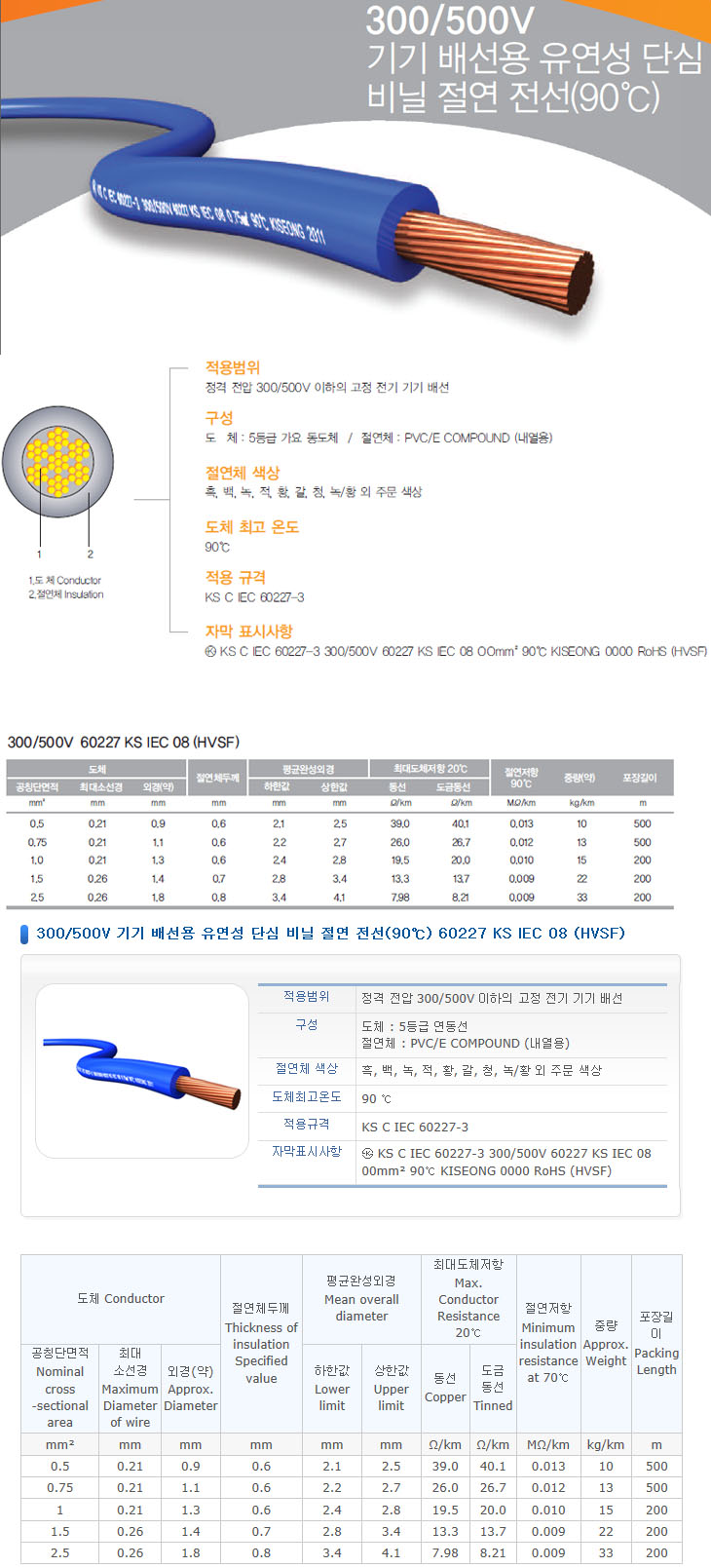 [KS]Àü¿øÄÉÀ̺í 300/500V ±â±â ¹è¼±¿ë À¯¿¬¼º ´Ü½É ºñ´Ò Àý¿¬ Àü¼±(90¡É) 60227 KS IEC 08 (HVSF)