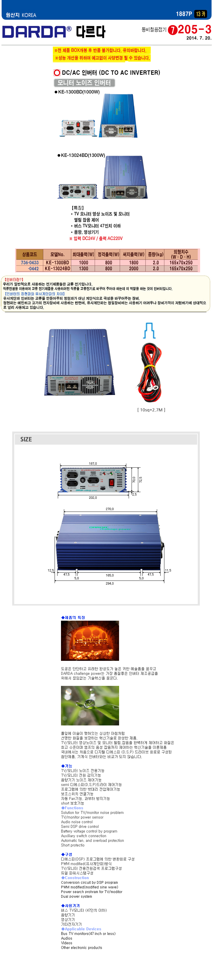 [DARDA]´Ù¸£´Ù DC/ACÀιöÅÍ/¸ð´ÏÅͳëÀÌÁîÀιöÅÍ(KE-13024BD,ÀÔ·Â:24VDC,Ãâ·Â:220VAC 1300Watt)(DC to AC Inverter)(ÁÖ¹®Àü Àç°íÈ®ÀÎ)