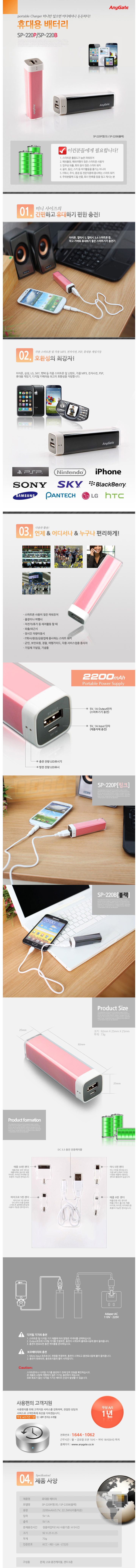 [COMS] ANYGATE ºñ»ó ÃæÀü±â(SP-220P/SP-220B, ¸®Æ¬À̿ 2200mAh/3.7V, 92x25x25mm, 73g)
