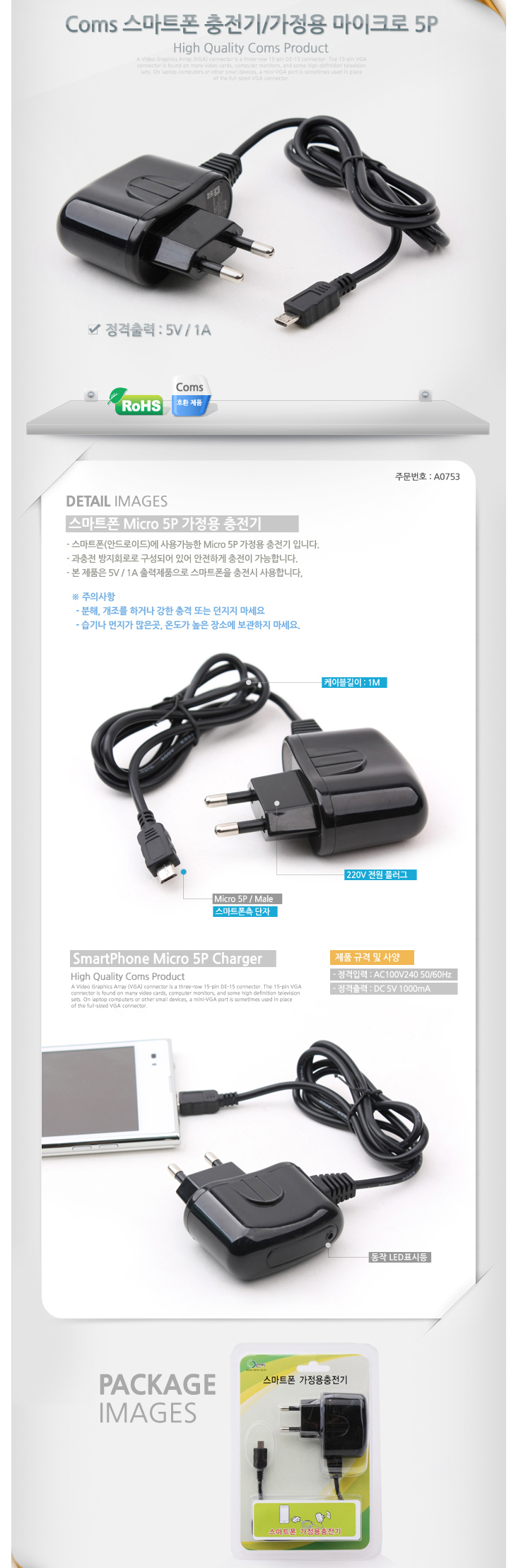 [COMS] 220V ¸ÖƼ ÃæÀü¿ë ½º¸¶Æ®Æù ÃæÀü±â/°¡Á¤¿ë ÃæÀü±â(¸¶ÀÌÅ©·Î5P 5V/1A)