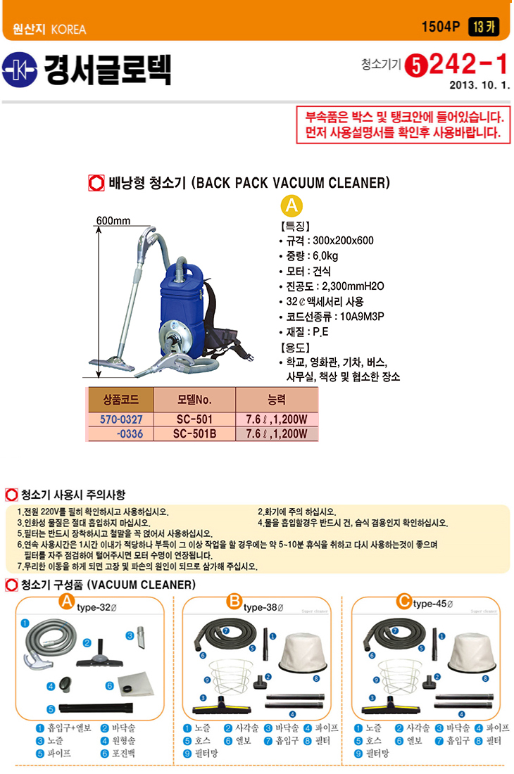 [°æ¼­] ¹è³¶Çü û¼Ò±â(SC-501/SC-501B, °Ç½Ä 1200Watt, 7.6¸®ÅÍ)