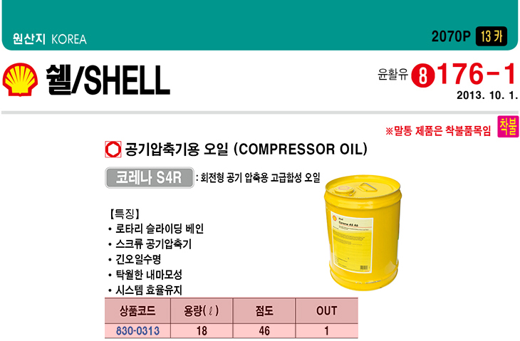 [Çѱ¹¼¿¼®À¯] °ø±â¾ÐÃà±â¿ë ¿ÀÀÏ/ÄÞÇÁ·¹»þ ¿ÀÀÏ(ÄÚ·¹³ª S4R, 18¸®ÅÍ, Á¡µµ:46, ȸÀüÇü °ø±â¾ÐÃà¿ë °í±ÞÇÕ¼º ¿ÀÀÏ)(Compressor Oil)