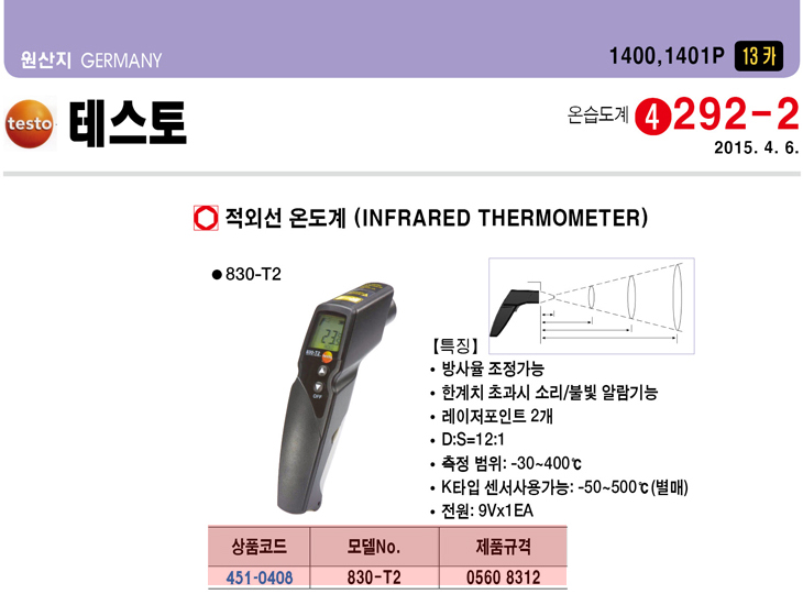 [Å×½ºÅä] TESTO Àû¿Ü¼± ¿Âµµ°è(830-T2, 0560 8312, -30~400¡É/K Type -50~500¡É¿É¼ÇÃ¤ÅØ °¡´É)(Infrared Thermometer)