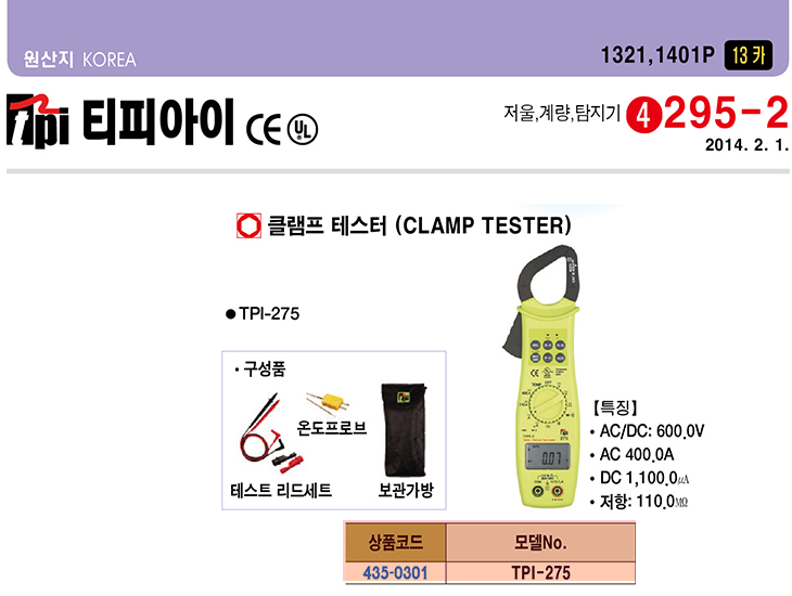 [ƼÇǾÆÀÌ] TPI Ŭ·¥ÇÁ Å×½ºÅÍ(TPI-275)(Digital Tester)(ÁÖ¹®Àü Àç°íÈ®ÀÎ)