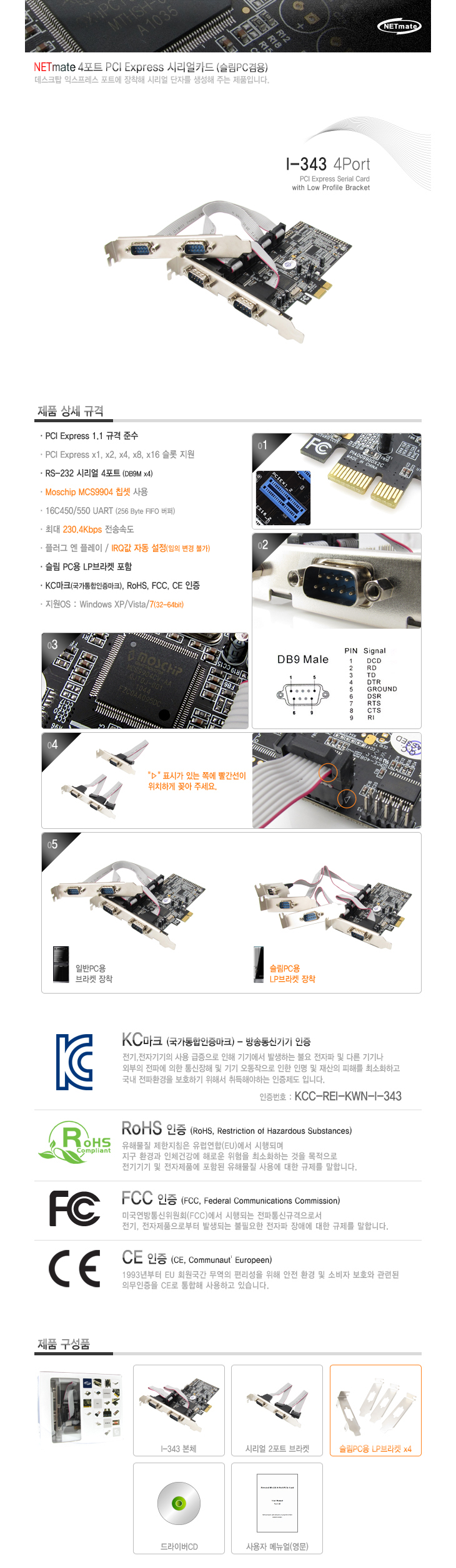 [³Ý¸ÞÀÌÆ®/KW] NETmate RS-232C 4Æ÷Æ® PCI Express ½Ã¸®¾óÄ«µå(I-343, DB9Mx4, Moschip MCS9904 Ĩ¼Â, ½½¸²PC°â¿ë)