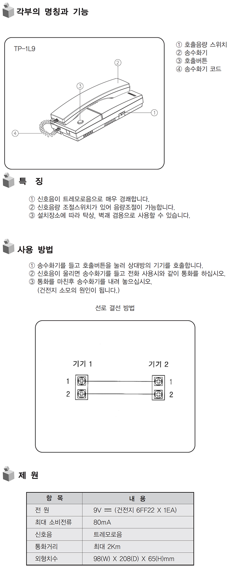 [WT] Äڸƽº 1:1 »óÈ£ÅëÈ­¹æ½Ä ÀÎÅÍÆù(TP-1L9, DC9V °ÇÀüÁö, ÅëÈ­°Å¸® 2Km, 1¼¼Æ® 2´ë¹­À½)(¹èÅ͸® º°¸Å)