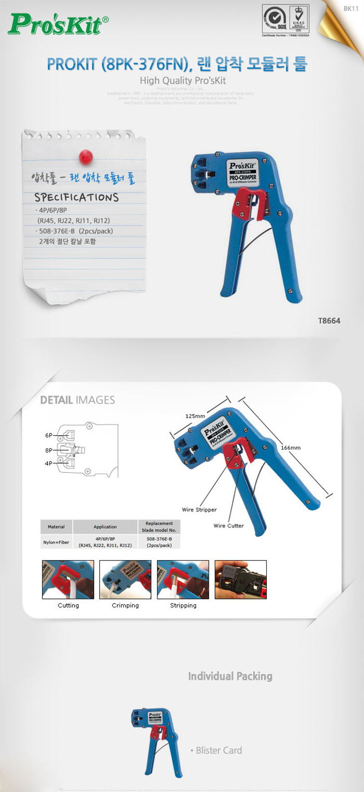 [COMS] Prokit ·£Åø(T8664/8PK-376FN, RJ45/RJ22/RJ11/RJ12, Àý´ÜÄ®³¯ Æ÷ÇÔ)