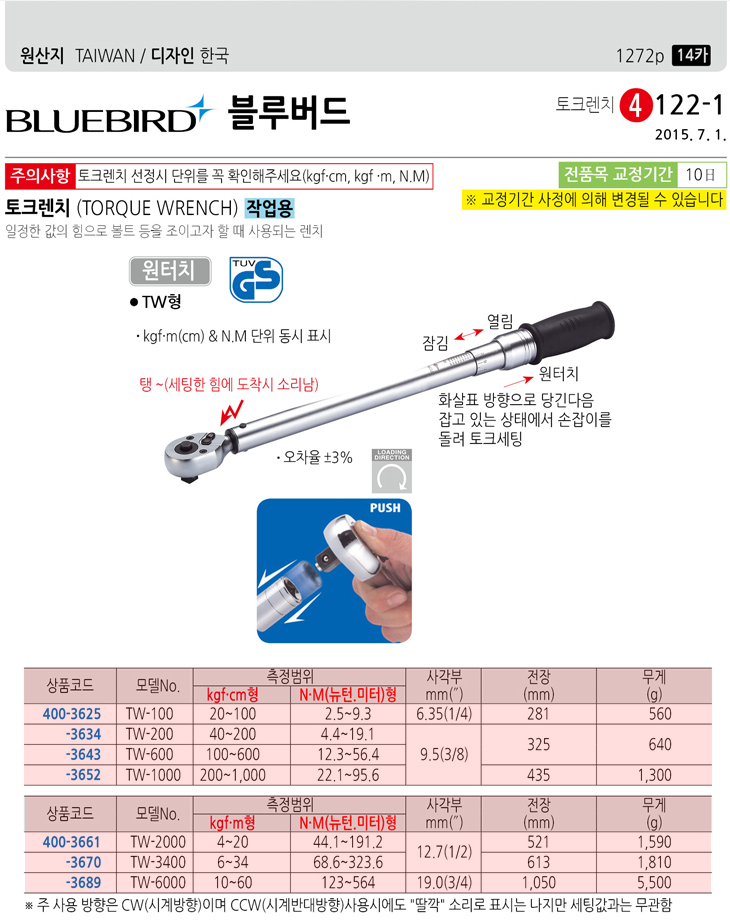 [ºí·ç¹öµå] ¿øÅÍÄ¡ ÀÛ¾÷¿ë ÅäÅ©·»Ä¡(TW-1000, 200~1000kgf.cm/22.1~95.6NM)(Torque Wrench)