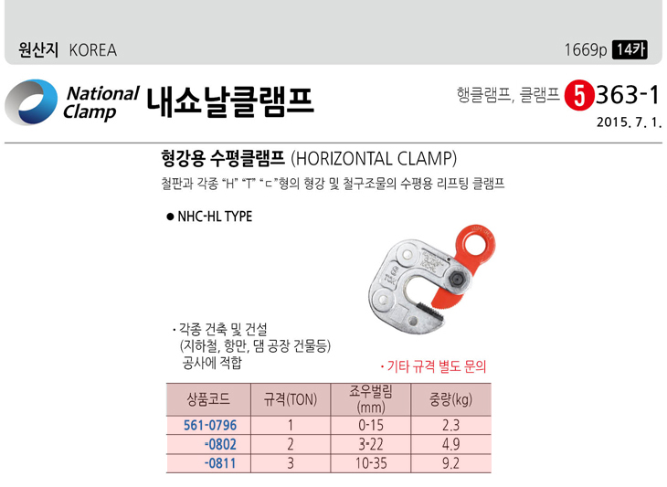 [³»¼î³¯Å¬·¥ÇÁ] Çü°­¿ë ¼öÆòŬ·¥ÇÁ(NHC-HL 1Ton, °ÇÃà/°Ç¼³ °ø»ç¿¡ ÀûÇÕ, H/TÇü°­ ¹× ö±¸Á¶¹°ÀÇ ¼öÆò¿ë ¸®ÇÁÆÃ Ŭ·¥ÇÁ)(Horizontal Clamp)
