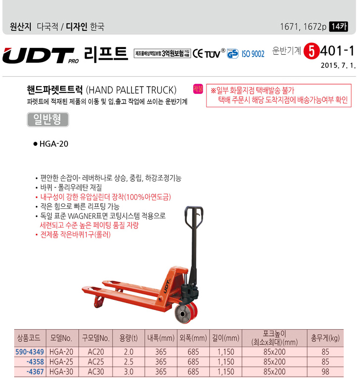 [UDT] ÇÚµå ÆÄ·¿Æ® Æ®·° (HGA-20/AC20, 2.0Ton)(Hand Pallet Truck)