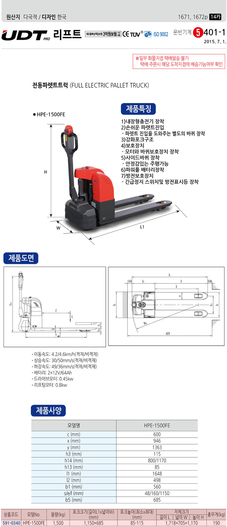[UDT] Àüµ¿ ÆÄ·¿Æ® Æ®·°(HPE-1500FE,1.5Ton,Æ÷Å©³ôÀÌ:85~115mm,ÁÖÇà ¹× ¸®ÇÁÆÃ ÀÚµ¿)(Full Electric Pallet Truck)(ÁÖ¹®Ç°)¡Ú°³º°¿ë´Þǰ¸ñ