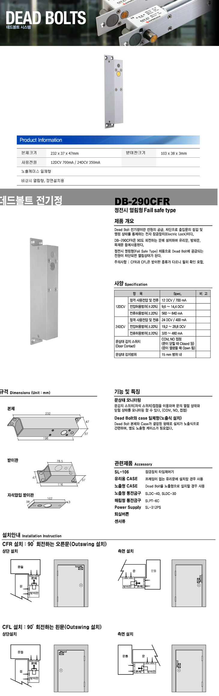 [SU] µ¥µåº¼Æ®(DB-290CFR, Á¤Àü½Ã ¿­¸²Çü, ³ëÃâÄÉÀ̽º ÀÏüÇü/ºñ»ó½Ã ¿­¸²Çü, Á¤¸é¼³Ä¡¿ë, DC12/24V, 232x37x47mm)(Dead Bolt Fail Safe)