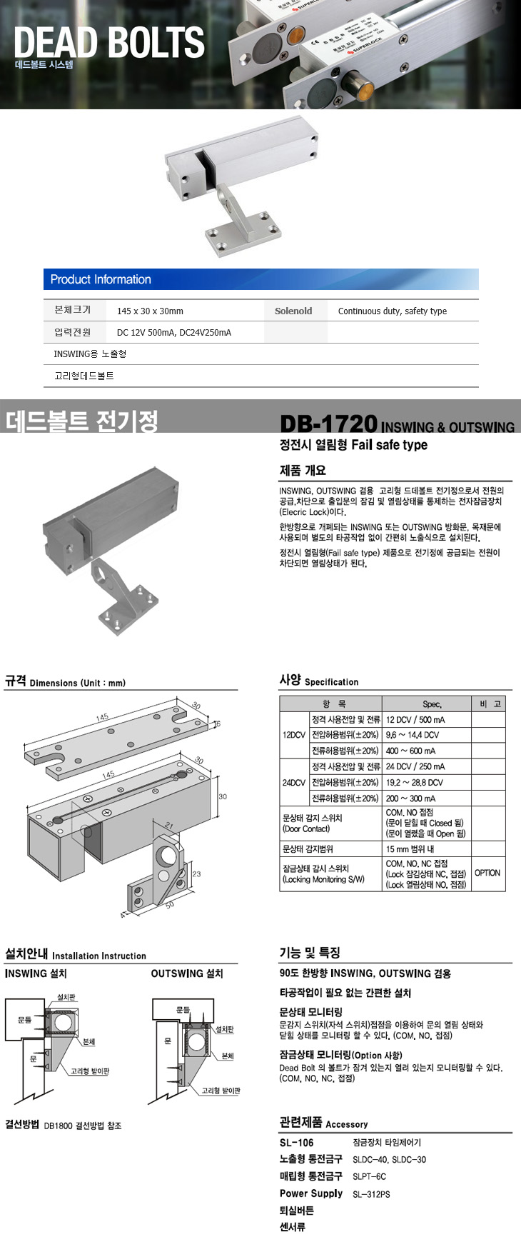 [SU] µ¥µåº¼Æ®(DB-1720, Á¤Àü½Ã ¿­¸²Çü, OUTSWING/INSWING°â¿ë ³ëÃâÇü/°í¸®Çüµ¥µåº¼Æ®, DC12/24V, 145x30x30mm)(Fail Safe Type)
