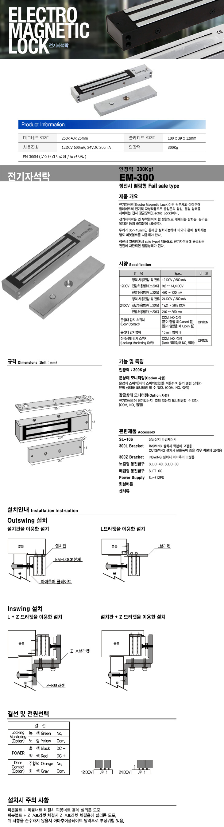 [SU] Àü±âÀÚ¼®¶ô/ÀÌ¿¥¶ô(EM-300, 250x43x25mm, DC12V/24V, 300Kg, EM-Lock)(Electro Magnetic Lock)
