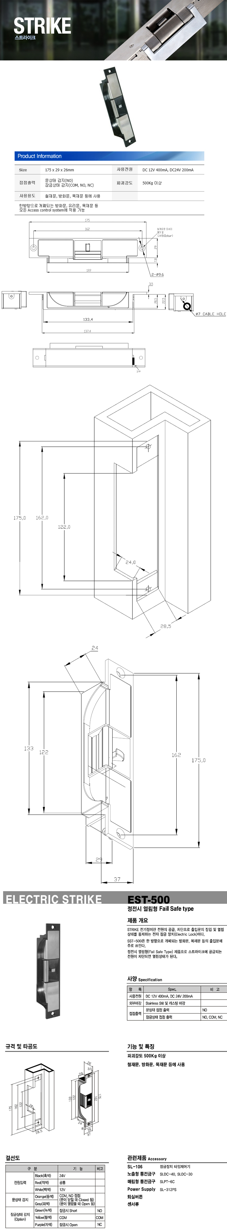 [SU] ½ºÆ®¶óÀÌÅ©¶ô(EST-500, Á¤Àü½Ã ¿­¸²Çü, DC12/24V, Æ®¶óÀÌ¸Æ ±Ô°Ý, öÀç¹®/¹æÈ­¹®/¸ñÀç¹®, 175x29x26mm)(Strike Lock)