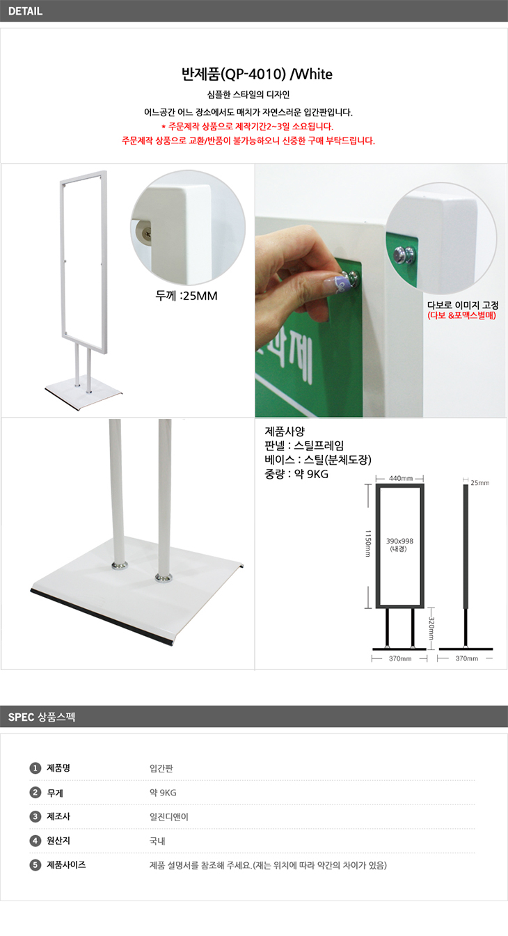 [ÀÏÁø] ½ºÅĵå ÇÁ·¹ÀÓ ¹ÝÁ¦Ç°(QP-4010 White, ³ôÀÌ:1470mm, ½ºÆ¿, Àμâ¸é:390x998mm)