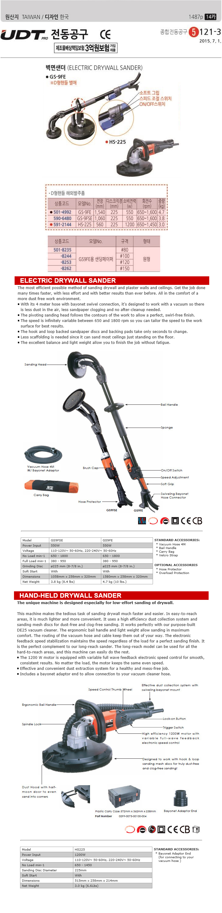 [UDT] º®¸é»÷´õ/±¤Åñâ/ºü»æ±â(HS-225, ÀüÀå:560mm, µð½ºÅ©Á÷°æ:22.5, ¼ÒºñÀü·Â:1200Watt)(Electric Drywall Sander)