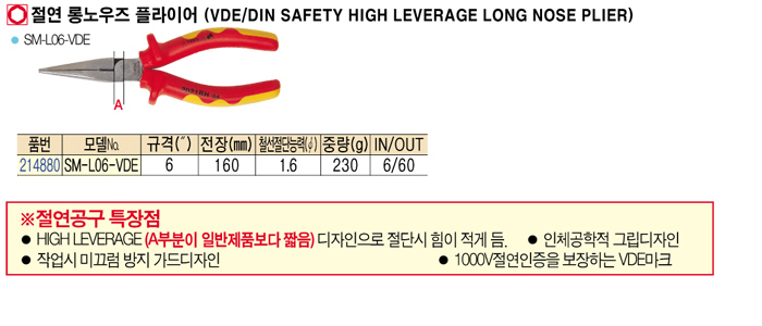 [½º¸¶Åä] Àý¿¬ ·Õ³ë¿ìÁî ÇöóÀ̾î(VDE/DIN safety high leverage long nose plier) SM-L06-VDE