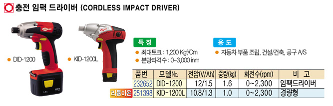 »ç¾ç # Àü¾Ð(DC): 10.8V # ÃÖ´ëÅäÅ© : 1,000 Kgf¡¤Cm # ¹«ºÎÇÏȸÀü¼ö : 2,200 RPM # ºÐ´ç Ÿ°Ý¼ö : 2,700 BPM # ÃÖ´ëÅäÅ©(Kgf-cm): 1,200 # Áß·® : 0.95 Kg