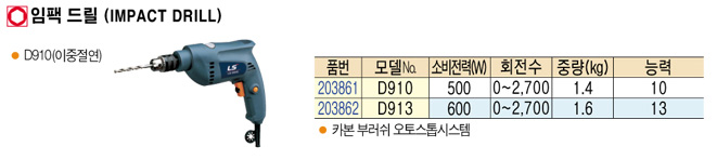 »ç¾ç ¡£¼ÒºñÀü·Â : 500W ¡£È¸Àü¼ö : 0 ~ 2,700rpm ¡£Áß·® : 1.4kg ¡£Ãµ°ø´É·Â : öÀç 10mm, ¸ñÀç 25mm, ÄÜÅ©¸®Æ® 13mm ¡£Å¸°Ý¼ö : 0 ~ 41,000bpm