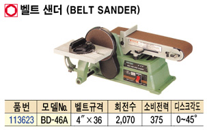 »ç¾ç ¼ÒºñÀü·Â : 450W ¹ëÆ® : 4¡È x 36¡È(102 x 914mm) µð½ºÅ© : 6¡È(152mm) ȸÀü¼ö : 2,070rpm ¹ëÆ® : 0¡Æ ~ 90¡Æ °¢µµÁ¶Àý µð½ºÅ© : 0¡Æ ~ 45¡Æ °¢µµÁ¶Àý ³ª¹«, ÇÃ¶ó½ºÆ½, ¾Ë·ç¹Ì´½, ½ºÆ¿Sanding Áß·® : 22kg