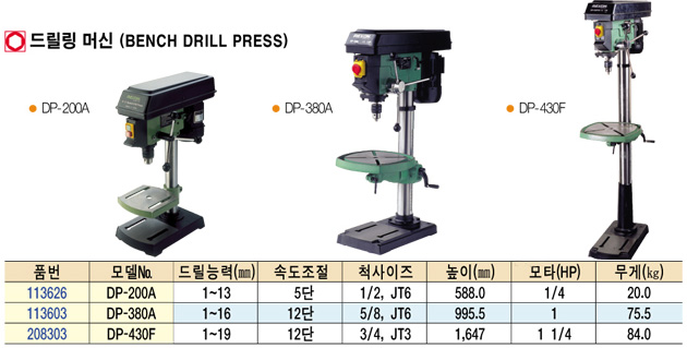 »ç¾ç ¼ÒºñÀü·Â : 750W Chuck : 16mm MT2 x JT3 ³ôÀÌ : 995.5mm 12´Ü ¼ÓµµÁ¶Àý : 250~3100m/min-1 Drill capacity : 22mm Table size : 336 x 336mm Áß·® : 75.5kg