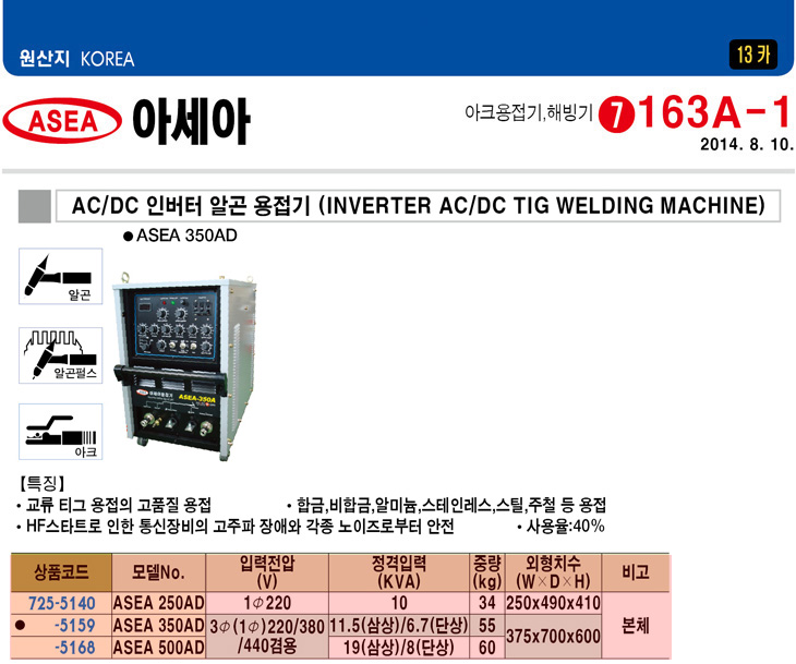 [¾Æ¼¼¾Æ] AC/DC ÀιöÅÍ ¾Ë°ï¿ëÁ¢±â(ASEA 500AD, »ï»ó/´Ü»ó220/380/440V°â¿ë, »ï»ó:19.0KVA/´Ü»ó:8.0KVA, º»Ã¼)(ÁÖ¹®Àü Àç°íÈ®ÀÎ)