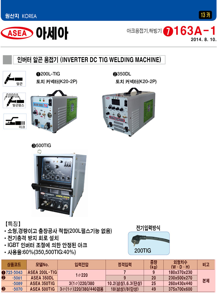 [¾Æ¼¼¾Æ] ÀιöÅÍ ¾Ë°ï ¿ëÁ¢±â(ASEA 350TIG, »ï»ó/´Ü»ó220/380V)(Inverter DC TIG Welding Machine)(ÁÖ¹®Àü Àç°íÈ®ÀÎ)