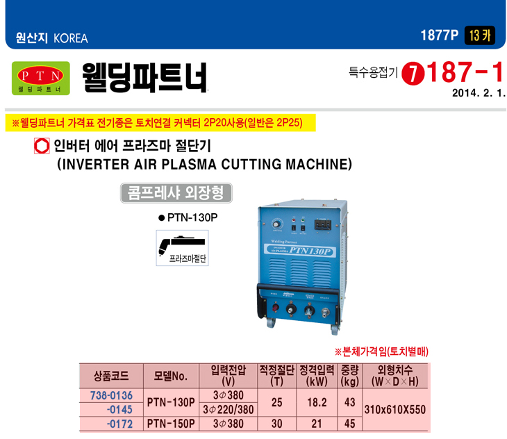[À£µùÆÄÆ®³Ê] ÀιöÅÍ ¿¡¾î ÇÁ¶óÁÀý´Ü±â(PTN-130P, Àü¿ø¼±ÅÃ, 18.2KWatt, ÄÞÇÁ·¹»þ¿ÜÀåÇü)(Inverter Air PLASMA Cutting Machine)