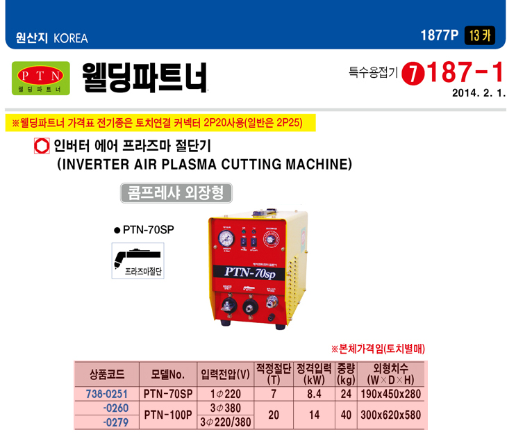 [À£µùÆÄÆ®³Ê] ÀιöÅÍ ¿¡¾î ÇÁ¶óÁÀý´Ü±â(PTN-100P, Àü¿ø¼±ÅÃ, 14KWatt, ÄÞÇÁ·¹»þ¿ÜÀåÇü)(Inverter Air PLASMA Cutting Machine)