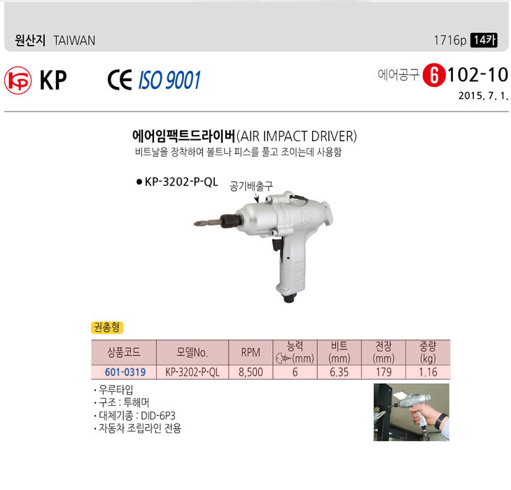 [KP] ¿¡¾îÀÓÆÑÆ® µå¶óÀ̹ö(KP-3202-P-QL, ±ÇÃÑÇü, 8500RPM, ´É·Â:6mm)(Air Impact Driver)
