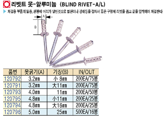 [´ëÈ­] ¸®ºªÆ® ¸ø-¾Ë·ç¹Ì´½(Blind rivet-A/L) ¸ø±½±â: 3.2mm ±âÀå : ¼Ò8mm(1ºÀ:200°³)