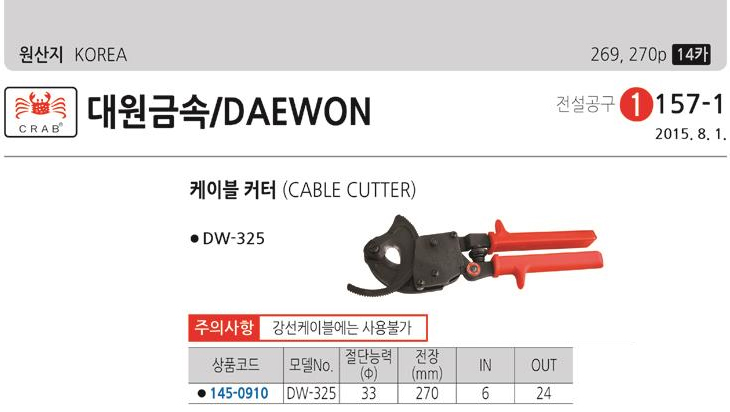 [´ë¿ø±Ý¼Ó] ¶óàÄÉÀ̺í Ä¿ÅÍ/ÄÉÀ̺í Àý´Ü±â/Àü¼±Ä¿ÅÍ/Àü¼±Àý´Ü±â/ÄÉÀ̺í ıŸ(DW-325 ±â¾î½Ä, Àý´Ü´É·Â:33ÆÄÀÌ, ÀüÀå:270mm)(Cable Cutter)