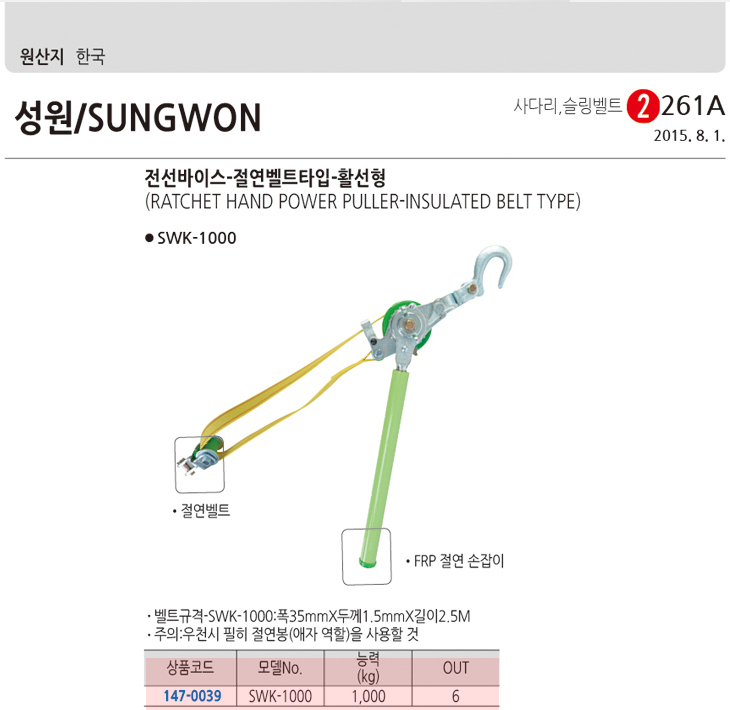 [¼º¿ø] Àü¼±¹ÙÀ̽º(Àý¿¬º§Æ®Å¸ÀÔ/Ȱ¼±Çü, SWK-1000, 1000Kg)(Ratchet Hand Power Puller Insulated Belt Type)