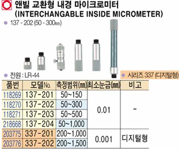 [mitutoyo] ¿£ºô ±³È¯Çü ³»°æ ¸¶ÀÌÅ©·Î ¹ÌÅÍ (INTERCHANGABLE INSIDE MICROMRTER) 337-202