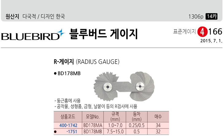 [ºí·ç¹öµå] R-°ÔÀÌÁö(BD178MB, 7.5~15.0mm, µîÂ÷:0.5mm, 32¸Å)(Radius Gauge)